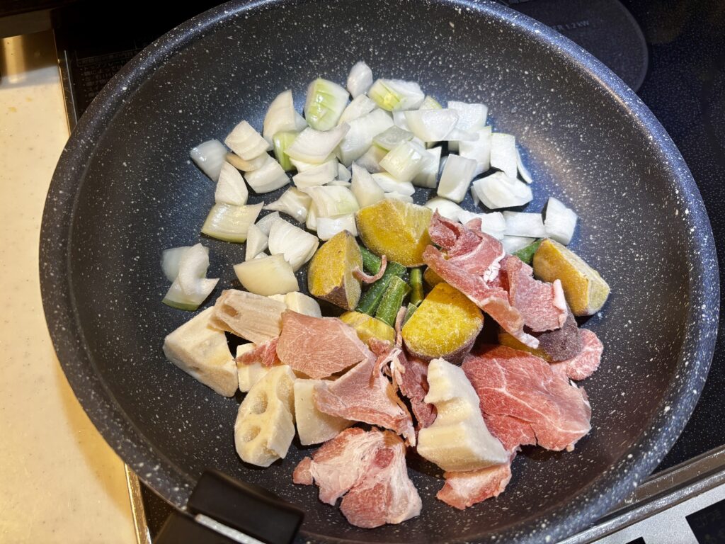 『たまねぎをぷらす さつまいもとれんこん・豚肉の甘酢あん』を作ります。