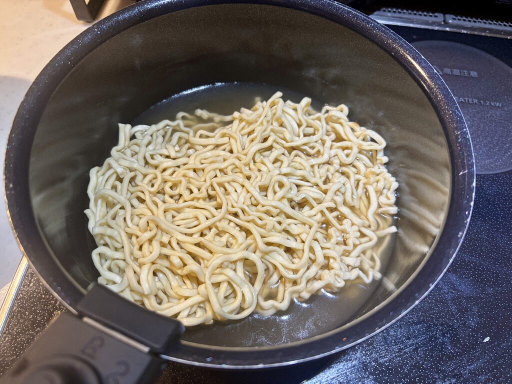 麺を沸騰したスープに入れ、ほぐしながら1分加熱します。
