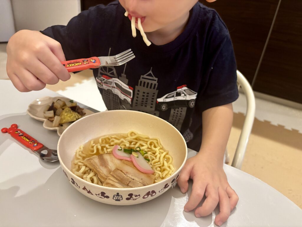 チャーシューは濃い味だったのですが、好きだったようで1口サイズにしたらバクバクと食べていました。