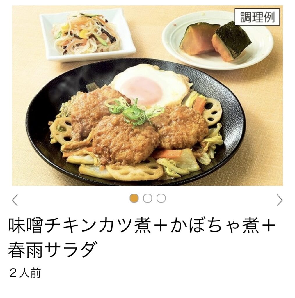 この『味噌チキンカツ煮+かぼちゃ煮+春雨サラダ』は、2人前と3人前が選べます。
