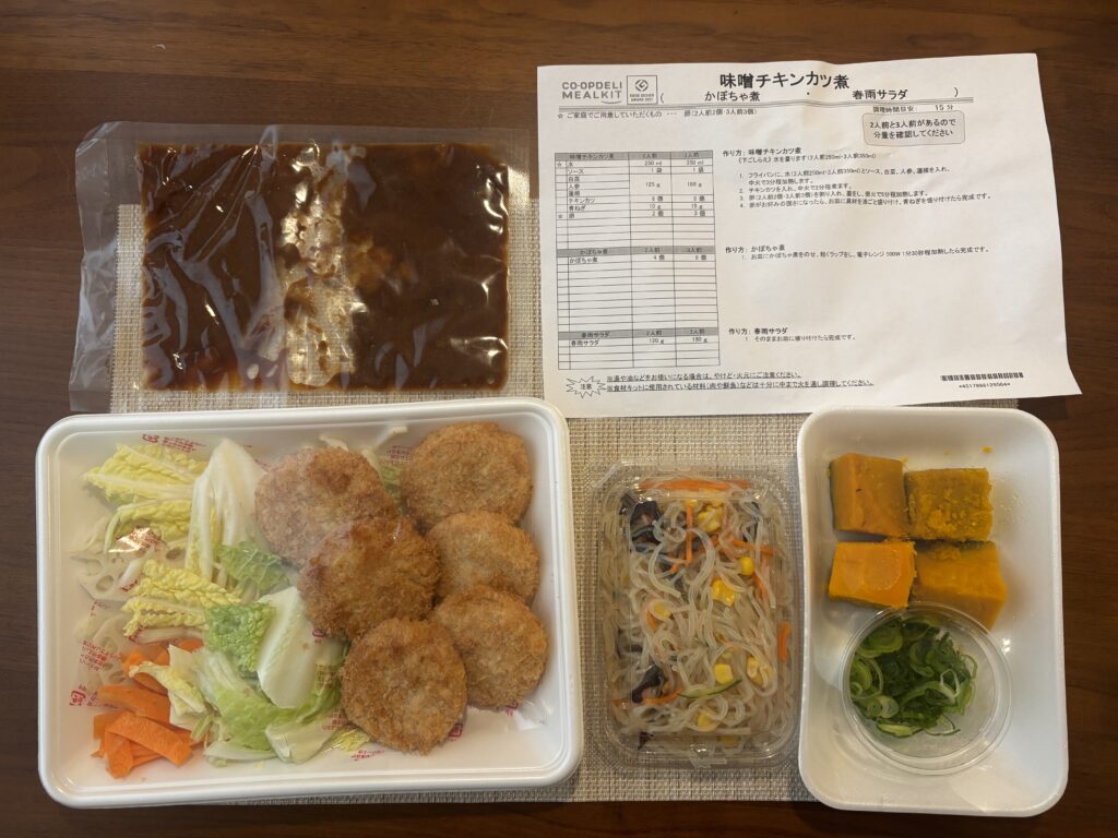 【実食レビュー】コープミールキット『味噌チキンカツ煮+かぼちゃ煮+春雨サラダ』を作ってみた【取り分け幼児食】