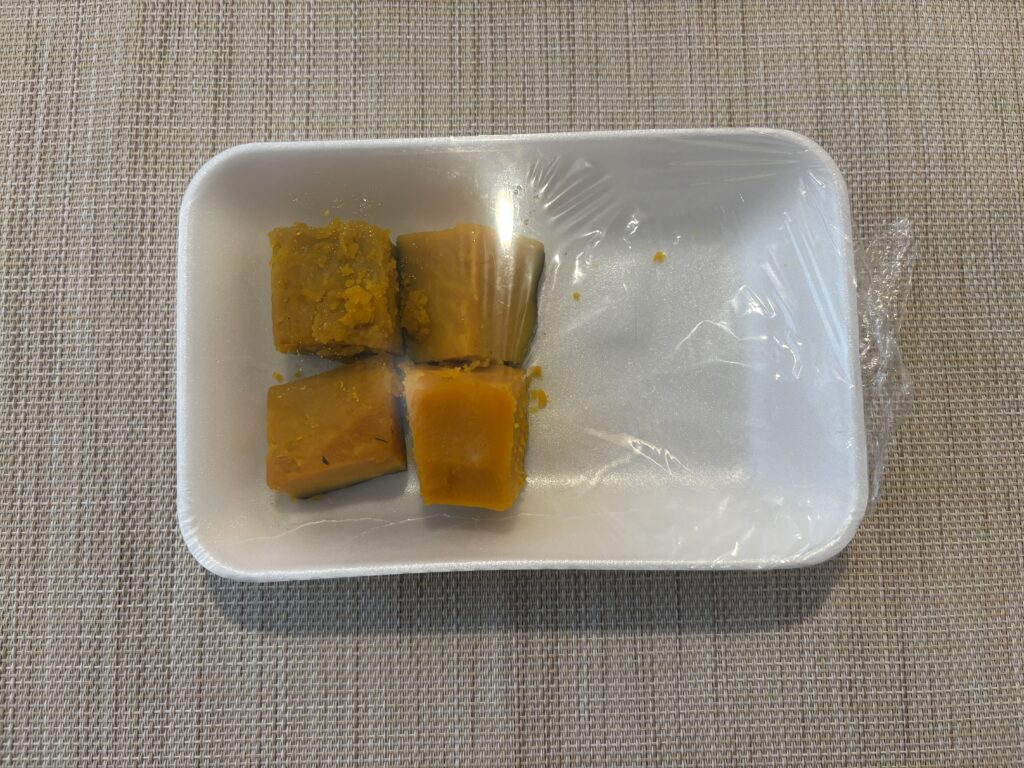副菜のかぼちゃ煮はほんのりした薄味でとても美味しかったのですが、レンチンしたことで少しパサパサしてしまいました。