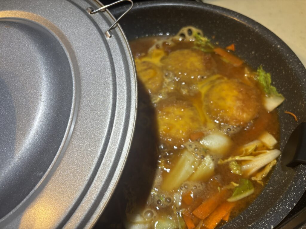 野菜は若干シャキシャキです、白菜好きな長男のために柔らかめに煮込みましたが柔らかくてもシャキシャキでもどちらでも合う感じでした。
