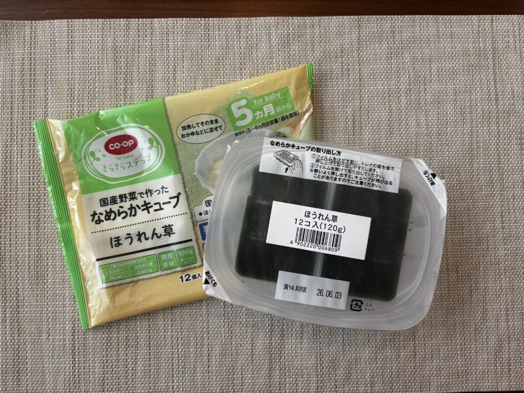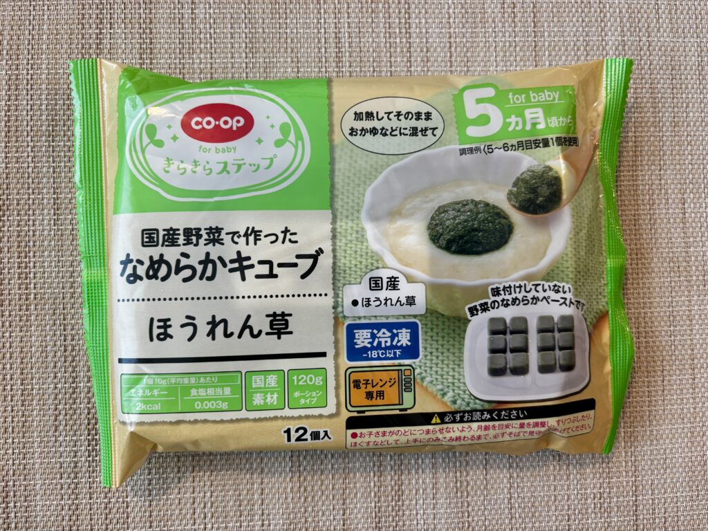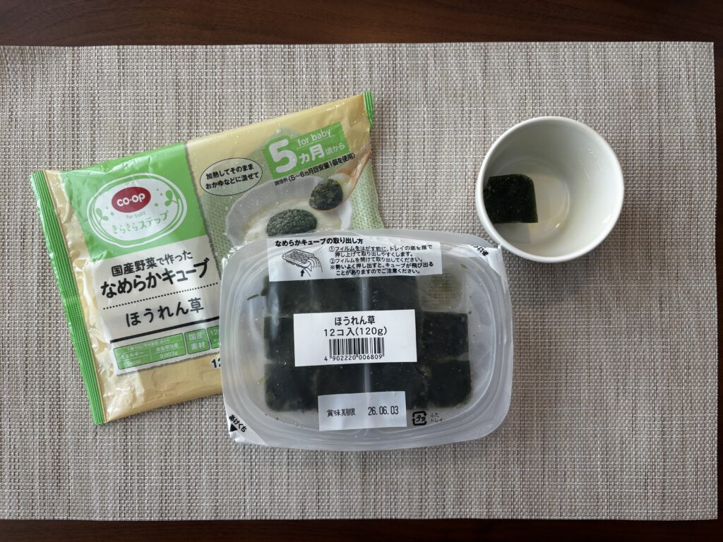 今回はコープデリで購入した、『国産野菜で作ったなめらかキューブ ほうれん草』を使った離乳食を紹介します!