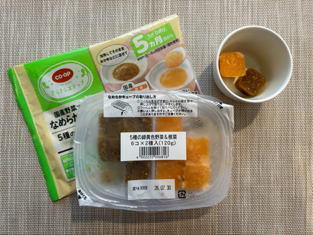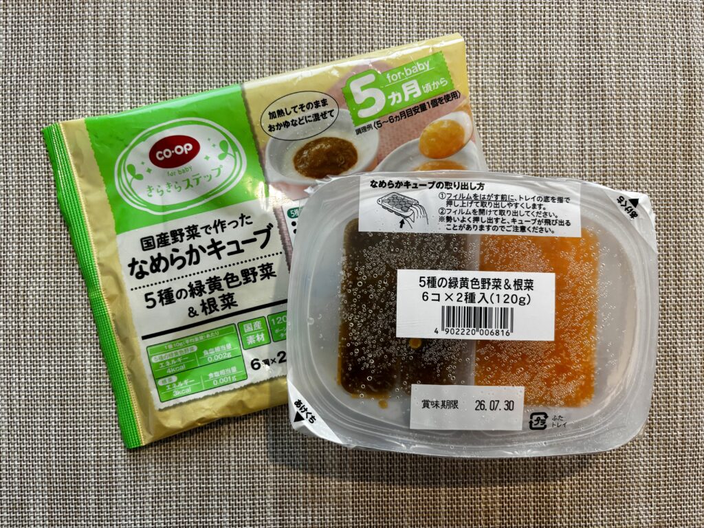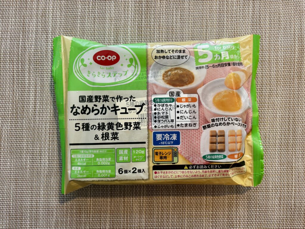 今回はコープデリで購入した、『国産野菜で作ったなめらかキューブ 5種の緑黄色野菜&根菜』を使った離乳食を紹介します!