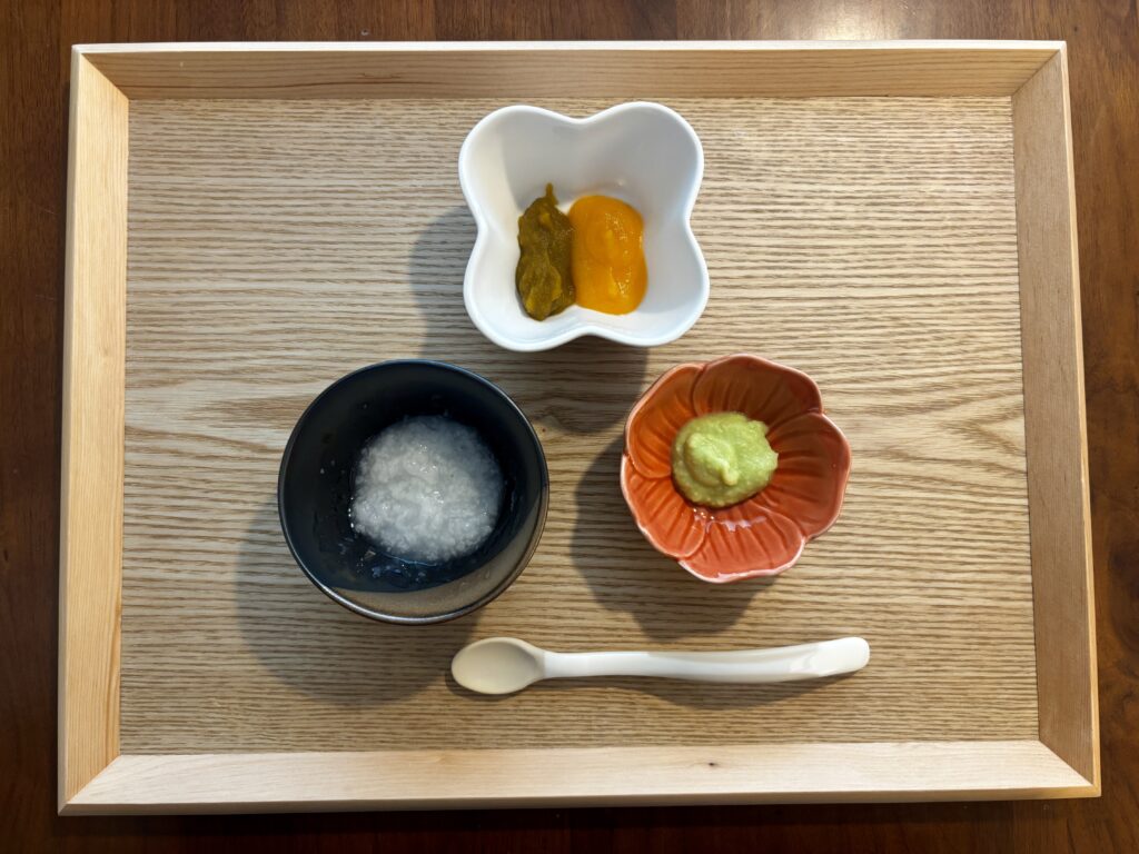 『国産米をふっくら炊いた白かゆ』8倍がゆ、5種の緑黄色野菜、根菜、枝豆です。